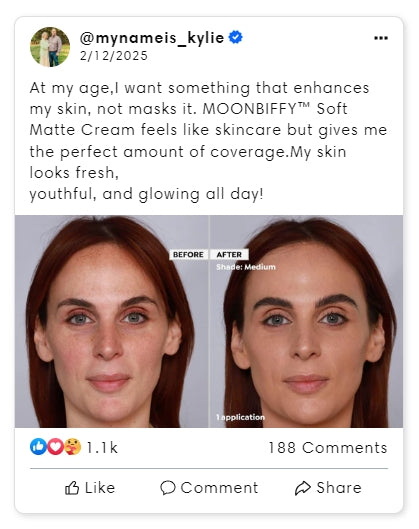 Experience the perfect fusion of skincare and makeup withMOONBIFFY… Soft Matte Cream, a revolutionary foundation makeupthat deeply hydrates and replenishes your skin while delivering aflawless, traceless finish.Infused with Peptides, Reishi Mushroom,Vitamins C&E, and Aloe Extract, this hydrating foundation nourishes,smooths, and enhances skin elasticity for a radiant, healthy glow.